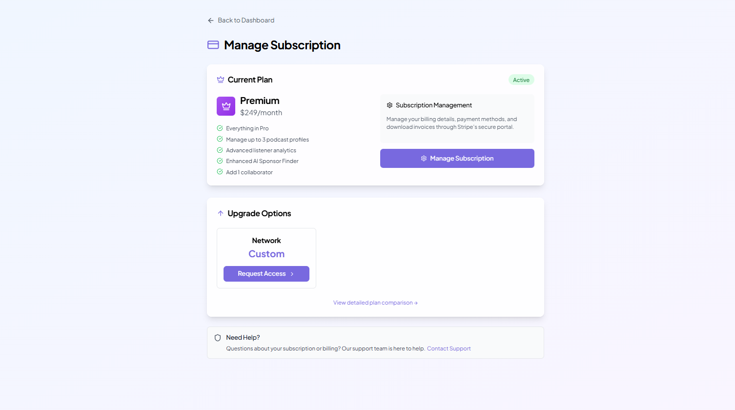 View your current plan, upgrade to Pro, Premium, or Network, and manage billing through Stripe.