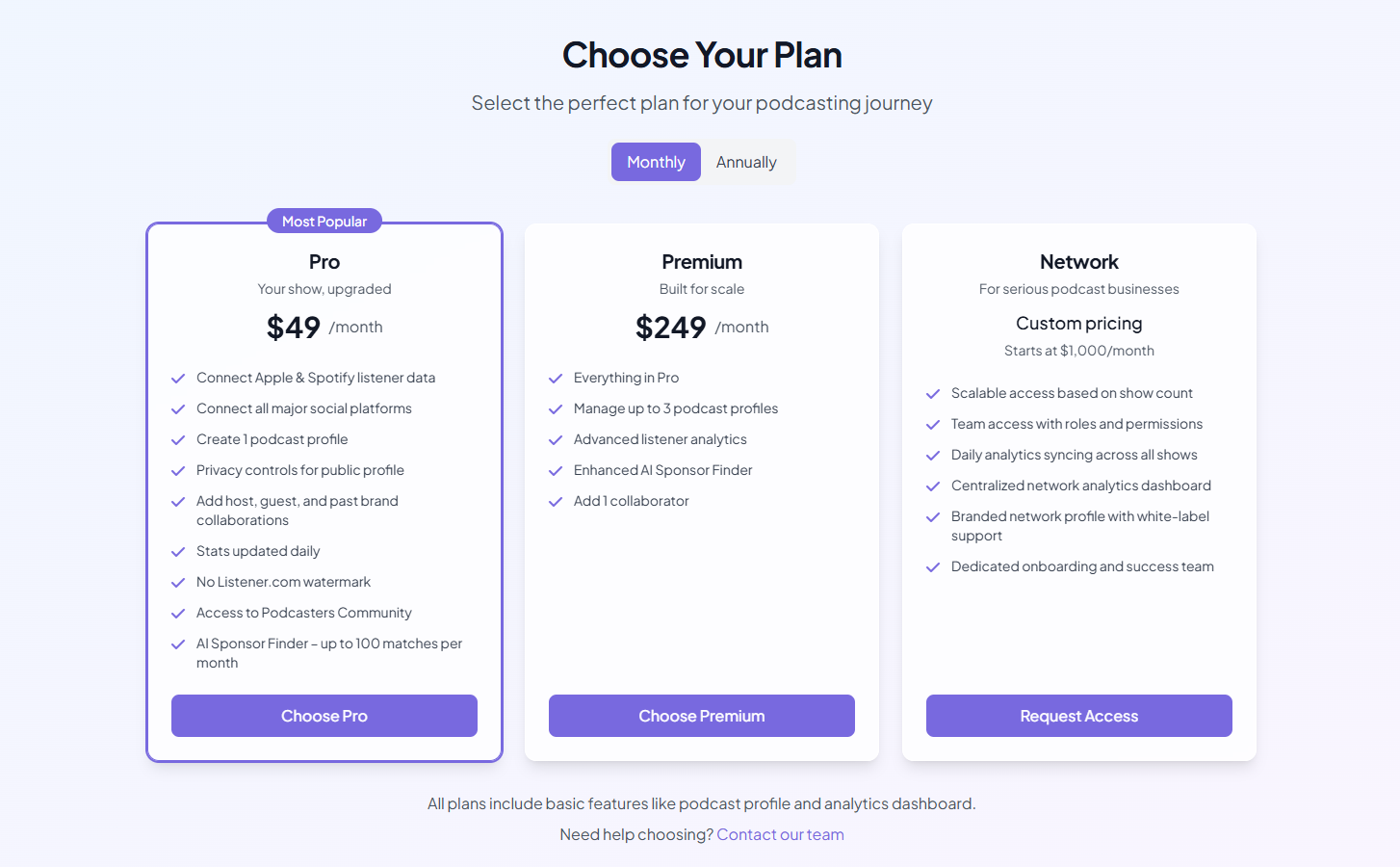 Listener.com offers four plans, each designed for a different stage of your podcasting journey:
