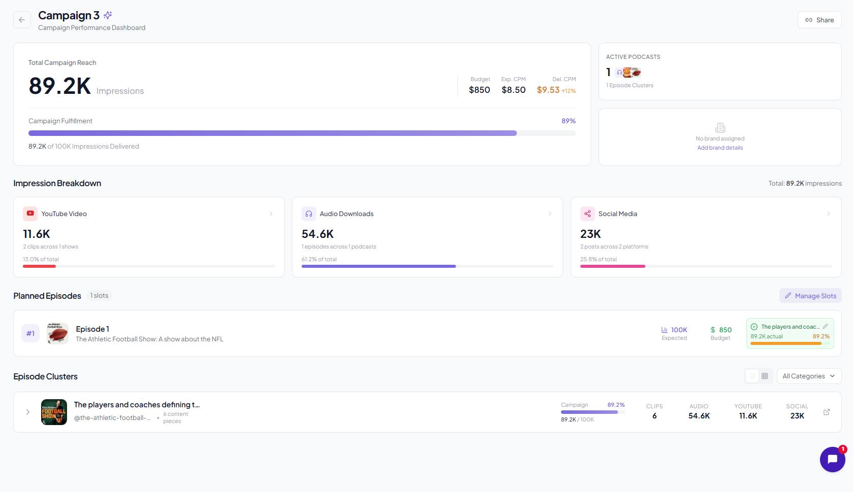 Campaigns let you organize sponsorship deals by brand, track impression goals, and measure performance across episode clusters. Navigate to Campaigns in the sidebar to get started.