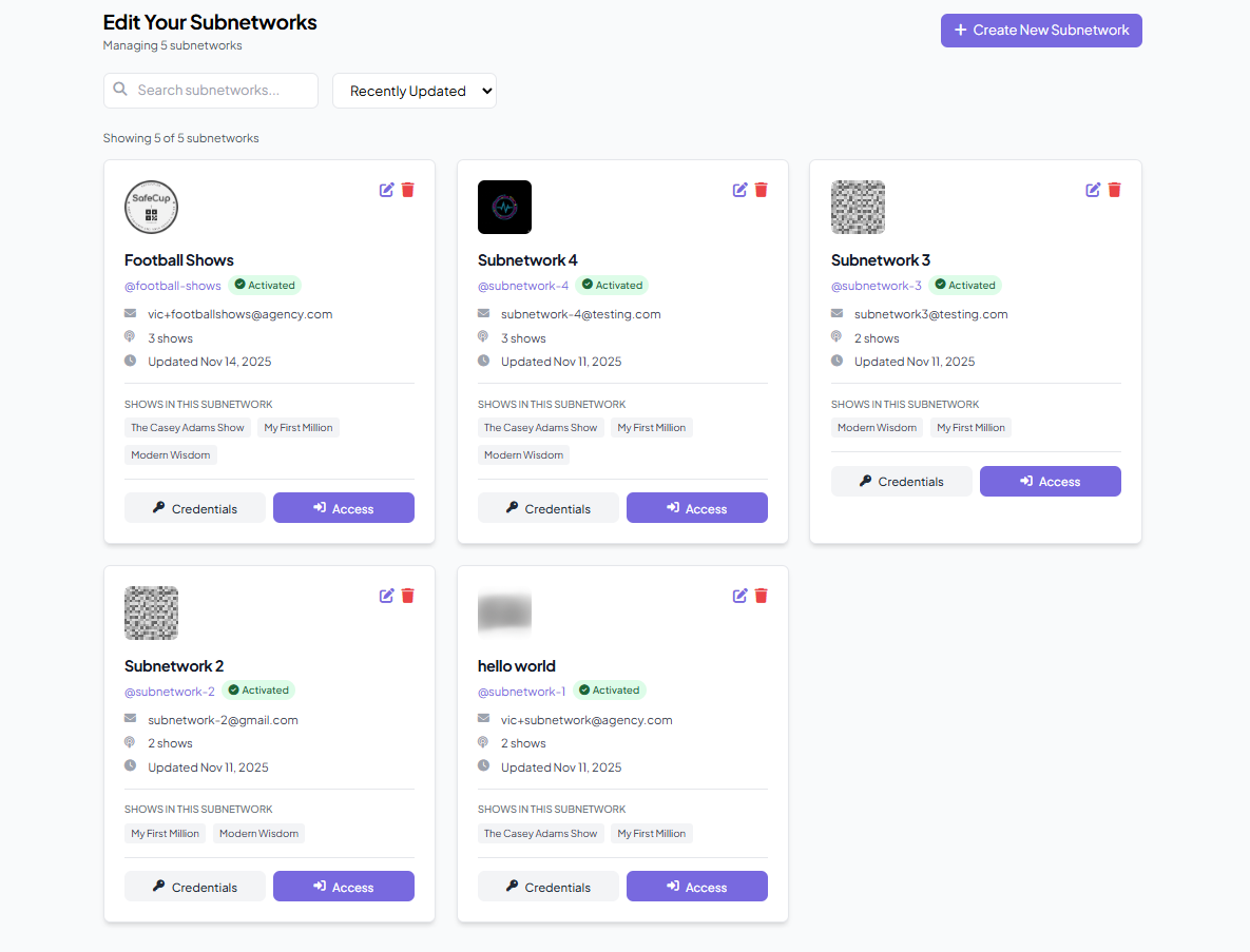 Subnetworks let you organize your network's shows into separate, self-contained groups — each with its own handle, login credentials, and public page.
