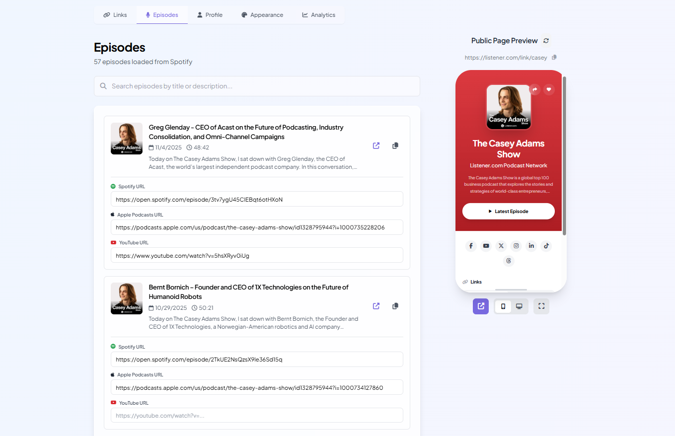 The My Links page gives you a centralized dashboard to view and manage all the link pages (Listener Links) across your network.