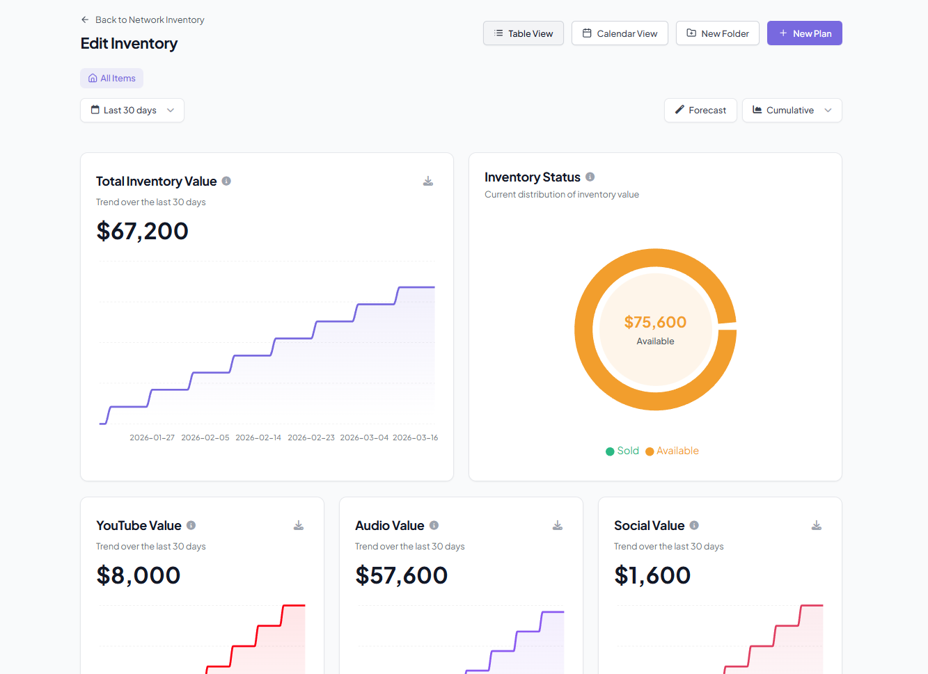 - Total Value — sum of all ad slot prices across all inventory plans